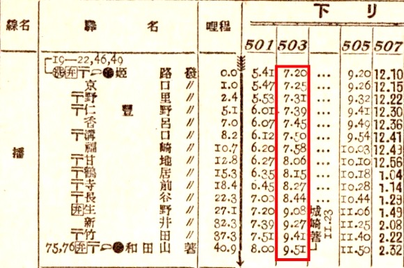 姫路を7時20分発の播但線の列車は城崎行きです。和田山へは9時51分に到着します。