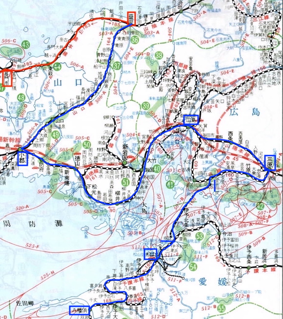 6日目の今日は益田→小郡→広島→三原→仁方→堀江→松山→八幡浜と進む。