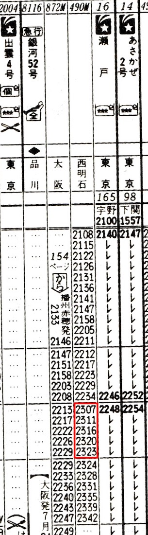 姫路で今日の旅が終えるのかと思ったが、山陽本線にはまだ列車があった。岡山発西明石行きの列車は、ここ姫路に2234に到着するが、寝台特急瀬戸と寝台特急あさかぜ2号の到着を待って姫路に33分停車している。そして加古川には2323であり今日の旅を終える。