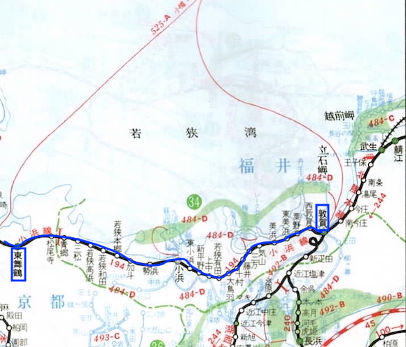 西舞鶴から東舞鶴へ。この列車は浜田を0625に出発した列車で、終点の東舞鶴まで14時間28分の長旅の最後をともにすることとなった。東舞鶴から小浜線の最終列車で終点敦賀へはもうすぐ日付が変わる2346に到着する。