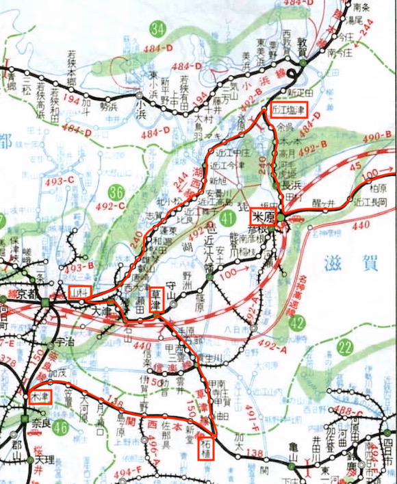 次いで米原→近江塩津→山科→草津→柘植→木津と移動する。