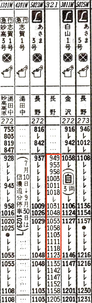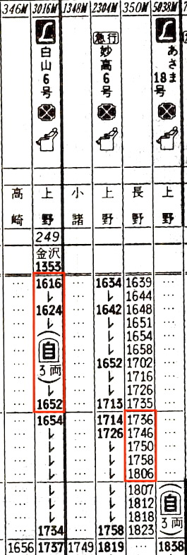 高崎では特急あさま3号が、3分前に出発したばかり。次の特急白山1号よりも普通列車の方が小諸に早く到着する。