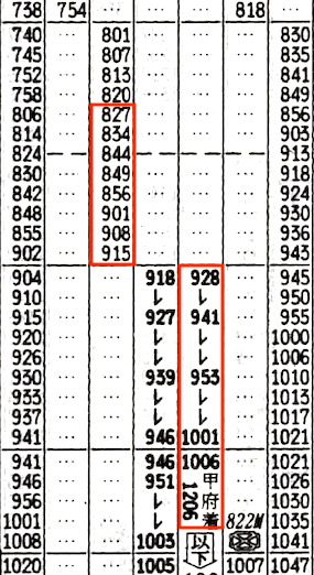 富士から身延線に乗り入れる。富士宮、芝川、内船、身延、下部、甲斐岩間、鰍沢口、市川本町、東花輪、南甲府とこまめに停車し、終点の甲府には1206の到着である。
