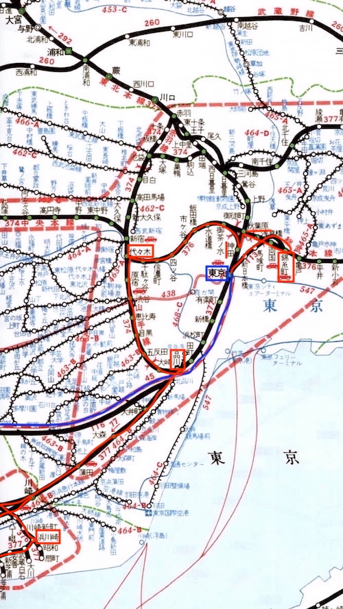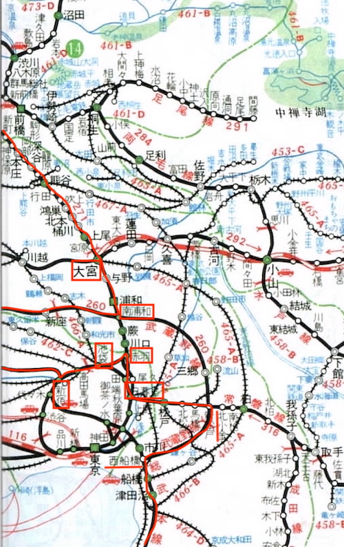 次いで倉賀野→大宮→南浦和→西国分寺→新宿→池袋→赤羽→日暮里→新松戸→西船橋→千葉と進む。
