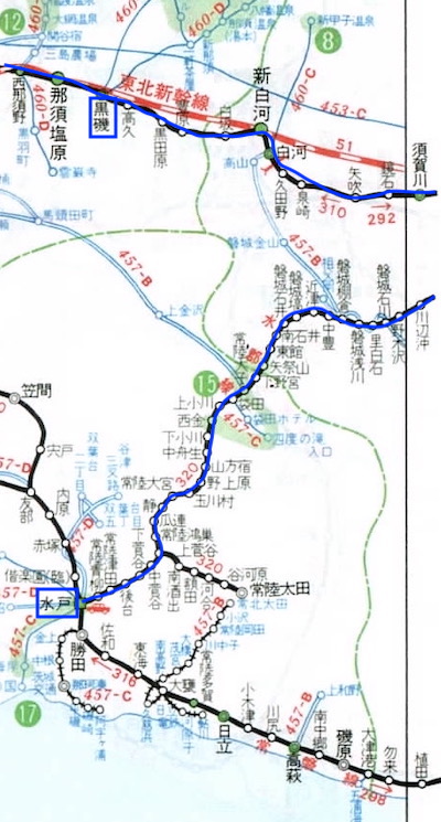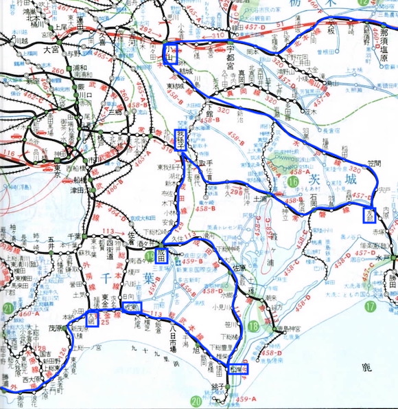 水戸で本日の旅程は終える計画だったが、旅程を見直している時に常磐線を北上する列車があるのに気がついた。当初計画時に気がついていないといけない。そのため地図の青線と赤線が日付毎にならなくなってしまった。