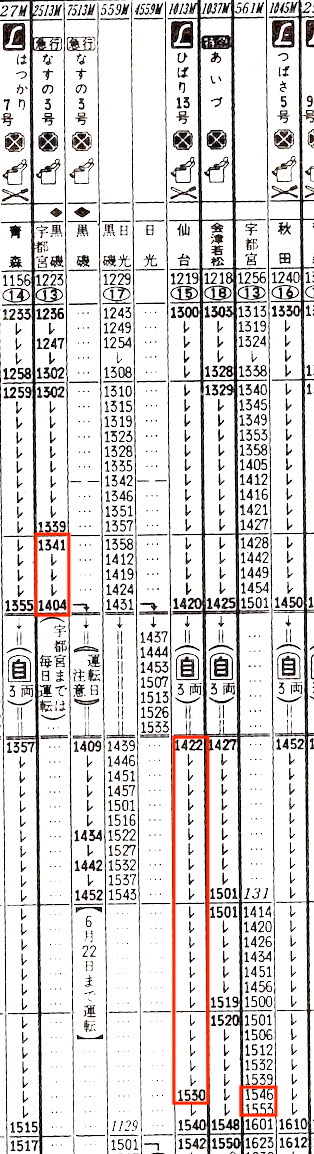 小山では9分の待ち時間で急行なすの3号に乗り換える。6月22日は黒磯まで運転していたが、現在では宇都宮止まり。宇都宮で特急ひばり13号に乗り換えて須賀川で途中下車。普通列車に乗り換えて郡山の一つ手前の安積永盛で下車する。
