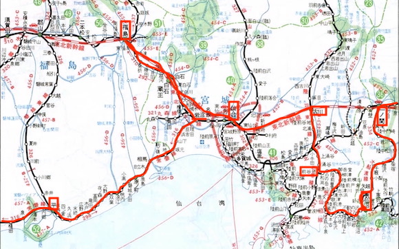 19日目の今日は原ノ町→岩沼→福島→(新幹線)→仙台→(新幹線)→古川→小牛田→前谷地→気仙沼→一ノ関と進む。