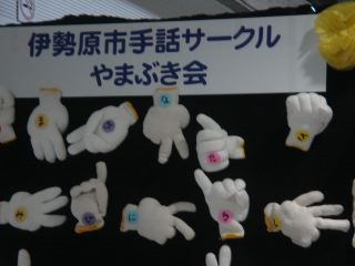 ボランティアフェスタ2005も同時開催でした。伊勢原市手話サークルのやまぶき会が軍手を使った手話文字の展示をしていました。