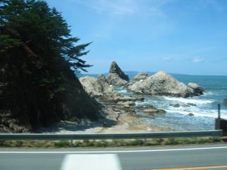 新潟ではいなほ3号(6両編成)に接続。あれっ、海側指定席を希望していたのに座席は山側だった。しっかりしてくれ、××ツアーよ。仕方がないので途中で自由席車両に移り海側で眺望のよい座席を確保する。しばらく新潟平野をのんびりと走っていたいなほ3号だが、村上を過ぎてしばらくすると進行方向左手に日本海が広がる。ここからは“笹川流れ”と呼ばれる景勝地である。