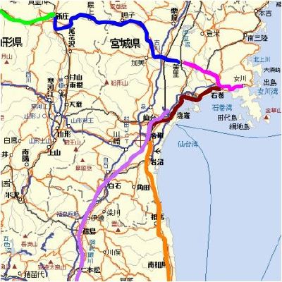 【緑】陸羽西線、【青】陸羽東線、【桃】石巻線、【茶】仙石線、【薄紫】東北本線・東北新幹線