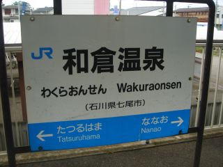 和倉温泉駅は、和倉温泉の最寄り駅であり、関西からの特急列車の走っている。駅には青柏祭の曳山で使われる「でか山」の総檜作りの車輪が展示してあった。直径2メートルである。また人口もそれほど多くなく小さな島なのに縦割り行政のために立派な橋が二つもかかってしまったという(税金の無駄遣い)能登島もここから近い。