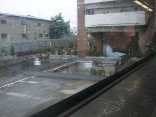 尼崎駅の手前でかなりの減速をする。ここは2005年4月25日に大きな事故を起こした現場だ(写真に人の顔が写っているが前の座席の人である)。ニュースで何回も見た建物がまだある。