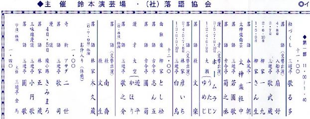 中に入るとプログラムを渡されます。表紙には今年の干支のイノシシがデザインされていました。元旦から10日までは、吉例落語協会初顔見世特別公演“新春爆笑特別興行”で多くの芸人さんが次々と登場します。プログラムに載っている中では林家木久蔵や綾小路きみまろは、休演なので見ることができませんでした。面白かったのは、三遊亭歌武蔵、三遊亭歌之介、古今亭志ん五、林家正蔵、三遊亭金馬などでした。