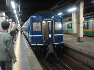 21時18分頃に寝台特急あけぼの青森行きが入線する。気動車を最後にして、最後尾から入ってくるので、最後尾のドアを開けて様子をみながらゆっくりと入線してくる。先頭車両が8号車で最後尾が1号車である。