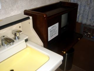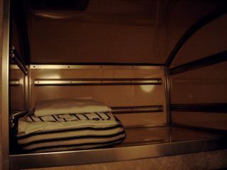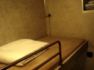 室内は、ソファにもなるベッドを中心に、テレビ・洗面台・読書灯・ハンガー・鏡・補助ベッド(上段)・踏み台などがある。